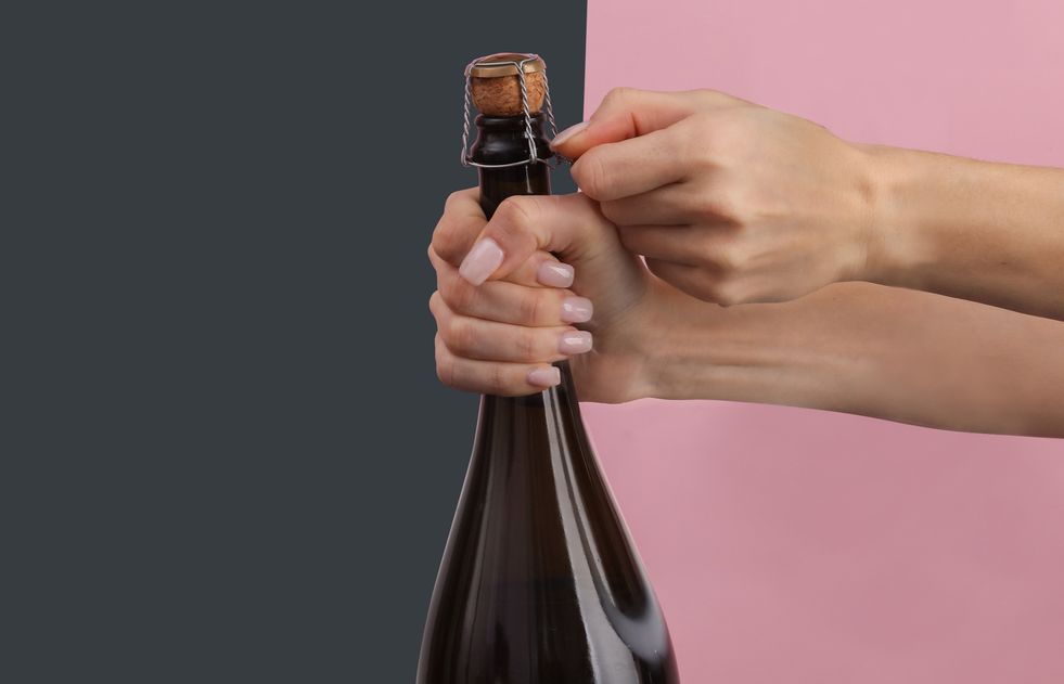 - Держите пробку и начинайте медленно вращать бутылку в разные стороны — не делайте наоборот! Когда пробка слегка раскачается, еще немного наклоните бутылку — из нее начнет выходить углекислый газ, и вы услышите приглушенное шипение.