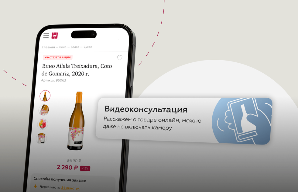 Теперь, просматривая товар на сайте или в приложении, вы можете связаться с винотекой по видеосвязи: получить емкую презентацию в режиме реального времени, задать вопросы и сориентироваться в выборе с помощью эксперта. Живое общение, как в реальной винотеке, максимум пользы и минимум времени. Камеру при этом включать необязательно!