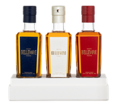 Bellevoye — это первый и пока единственный французский виски в стиле трипл молт: ассамбляж солодовых спиртов с трех лучших вискикурен Франции. Также это единственный французский виски, который пьют в Елисейском дворце — резиденции Президента Франции — и предлагают пассажирам первого и бизнес-классов авиакомпании Air France. В сет Bellevoye Discovery вошли три релиза, в которых сделан акцент на финишной выдержке в бочках из-под вина. Синяя этикетка — это новые бочки из мелкозернистого дуба с деликатным обжигом: делают вкус ванильным и ярким. Белая этикетка финишировала в бочках из из-под сотерна, сладкого вина из Бордо: они придают виски медовую мягкость. Красная этикетка проходит довыдержку в бочках из-под красных вин Гран Крю Сент-Эмильона: они добавляют ему пряных акцентов правобережного Бордо.